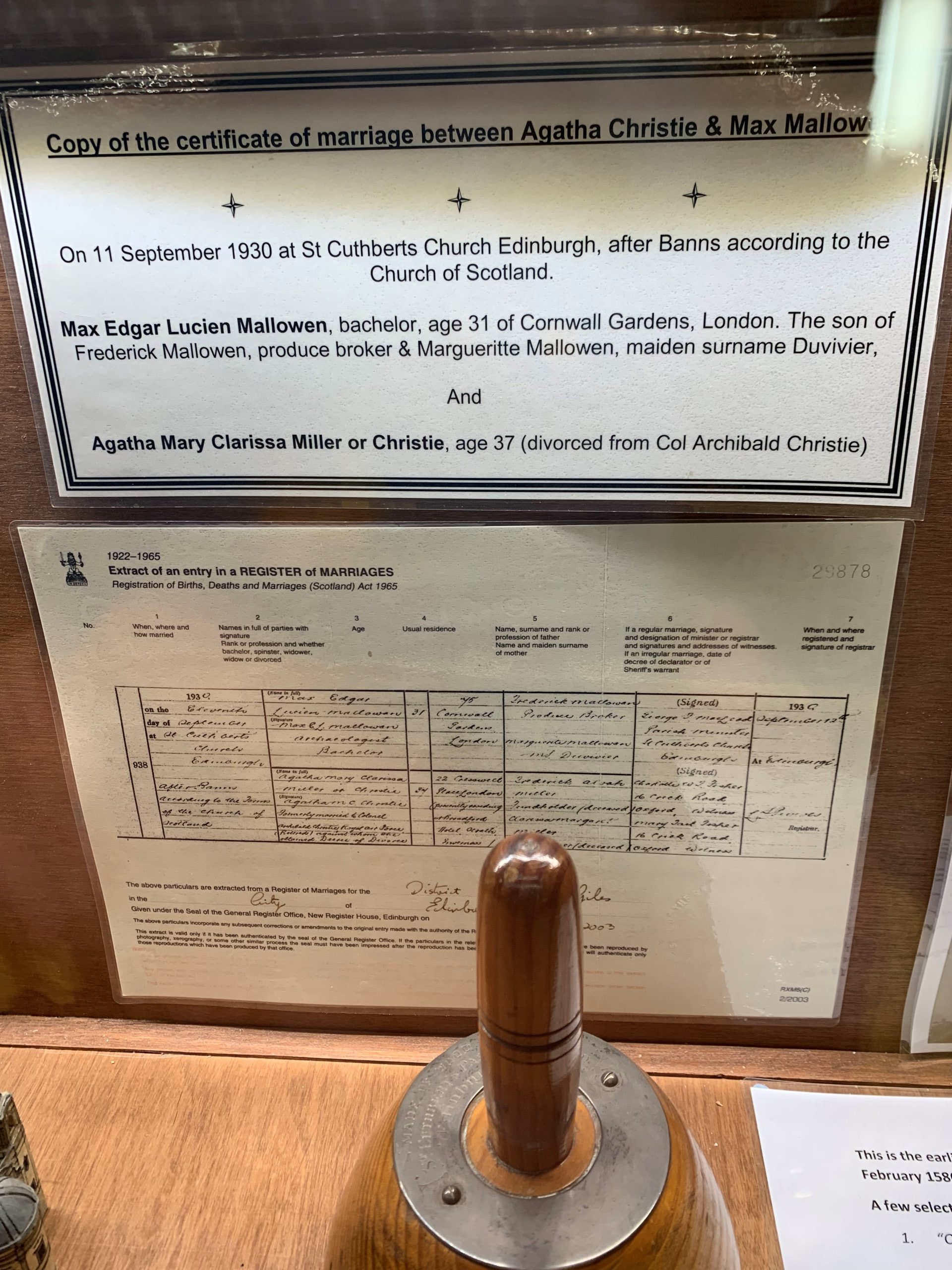It reads: “On September 11, 1930, after banns according to the Church of Scotland [the marriage took place of] Max Edgar Lucien Mallowan, age 31 and Agatha Mary Clarissa Miller or Christie, age 37 [divorced from Col Archibald Christie].”
